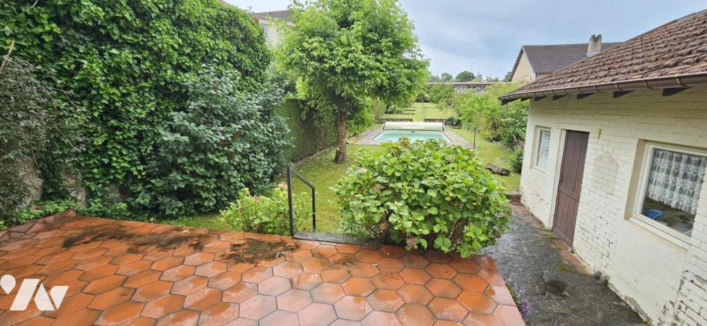 Entrée avec nombreux placards, WC, cuisine meublée avec accès terrasse et jardin, salle à manger, salon avec cheminée,